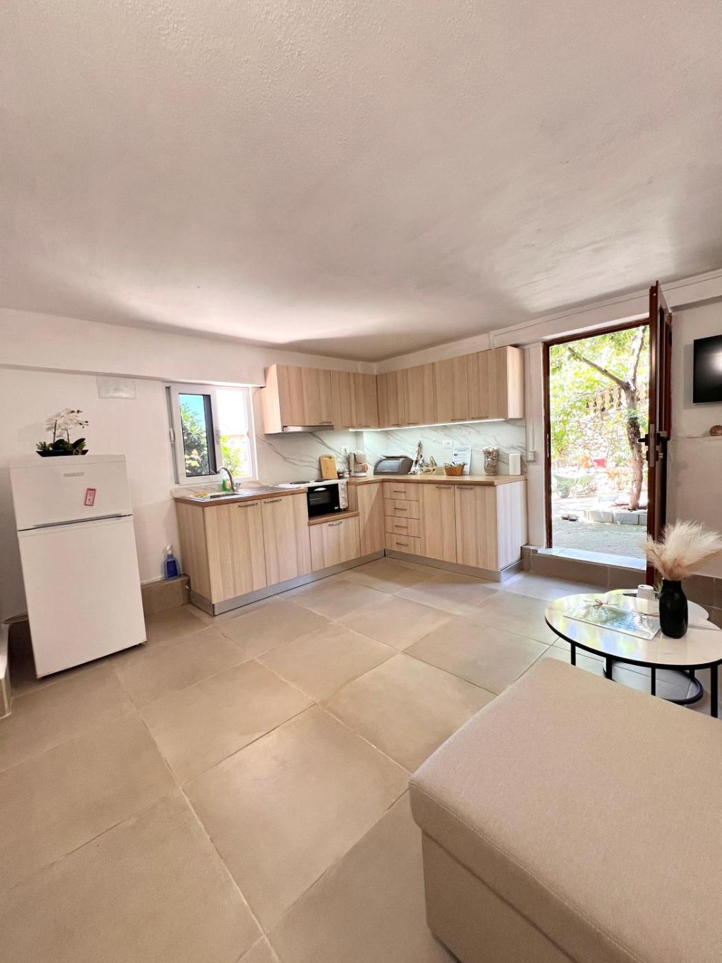 The spacious apartment with a terrace and garden views has 1 bedroom, a living room, a flat-screen TV, an equipped kitchen with an oven and a fridge, and 1 bathroom with a bath. A private entrance leads gueststhe apartment,they can enjoy some fruits. The property has an outdoor dining area.